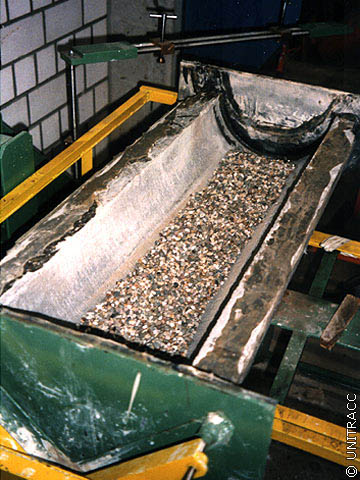 Kipprinnenversuch nach DIN 19565 [DIN19565a] [Quelle: STEIN Ingenieure GmbH] - Eingebaute Betonrohrhalbschale mit Prüfmaterial |