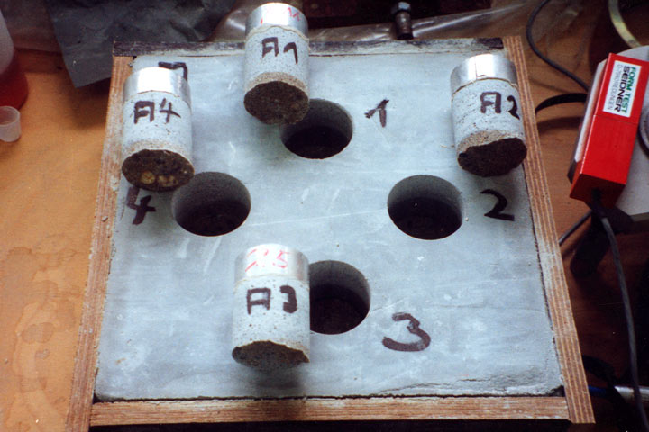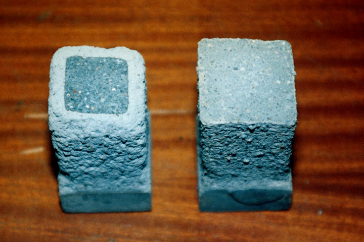 Während die Biegezugfestigkeit gemäß DIN EN 196 Teil 1 [DINEN196] bestimmt werden kann, muß bei der Druckfestigkeitsprüfung die Druckkraft, nicht wie in DIN EN 196 [DINEN196] angegeben, über die Seitenflächen der Mörtelbruchstücke, sondern über die zuvor plan zu schleifenden Stirnflächen eingeleitet werden, da über die korrodierten Seitenflächen eine gleichmäßige Krafteinleitung nicht möglich ist. Da die exakte Bestimmung der Querschnittsfläche der korrodierten Proben nur mit erheblichem Aufwand möglich ist, wird bei der Bestimmung der Biegezug- und Druckfestigkeiten jeweils die Ausgangsfläche von 40 x 40 mm2 zu Grunde gelegt. Es handelt sich hierbei folglich nicht um Materialkennwerte, sondern um reine Vergleichsgrößen.