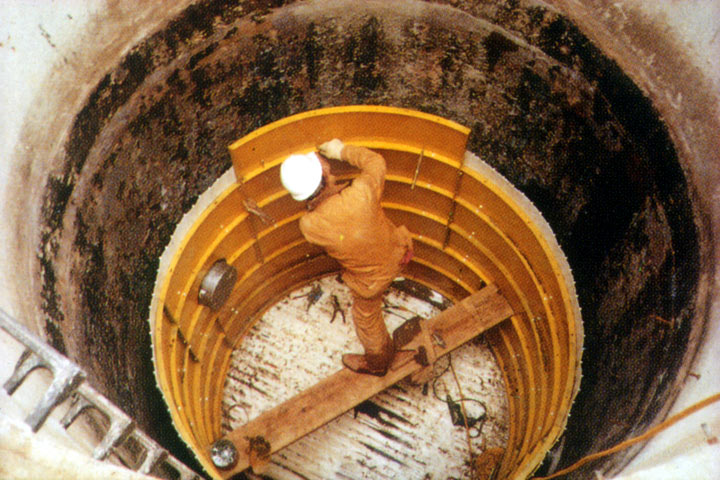 Auskleidung mit integrierten Verankerungselementen: Permaform Manhole-System [FI-Insit] - Einbau der Systemschalung zur Stützung der Kunststoffauskleidung und des Verfüllbetons |