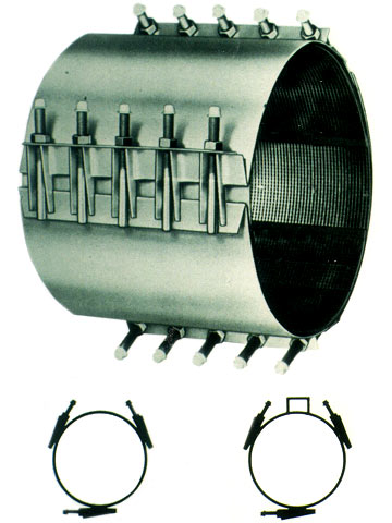 Zur Außenabdichtung örtlich begrenzter Undichtigkeiten, z.B. von Querrissen, begrenzten Rohrbrüchen, undichten Rohrverbindungen (Falzverbindungen) auch kombiniert mit Lageabweichungen geringen Ausmaßes in Horizontal- und Vertikalrichtung, stehen mehrteilige Manschetten aus rostfreiem Stahl mit einer elastomeren Innenbeschichtung zur Verfügung (Image 5.2.3.1.2-1) .