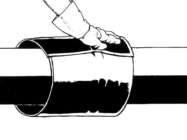 Beim Erwärmen der Muffe mit einer offenen, weich eingestellten Propangasflamme treten Schrumpfkräfte auf, welche den dauerplastischen Dichtungskleber in mögliche Hohlräume und Unebenheiten pressen, so daß eine feste und wasserdichte Rohrverbindung entsteht, die Abwinkelungen und Längsbewegungen zuläßt.