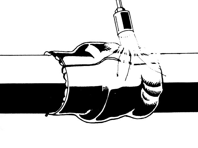 Der Arbeitsablauf bei der Abdichtung einer Rohrverbindung mit Hilfe eines Schrumpfschlauches ist in (Image 5.2.3.1.1-2) , (Image 5.2.3.1.1-3) und (Image 5.2.3.1.1-4) am Beispiel einer Gußrohrleitung dargestellt.