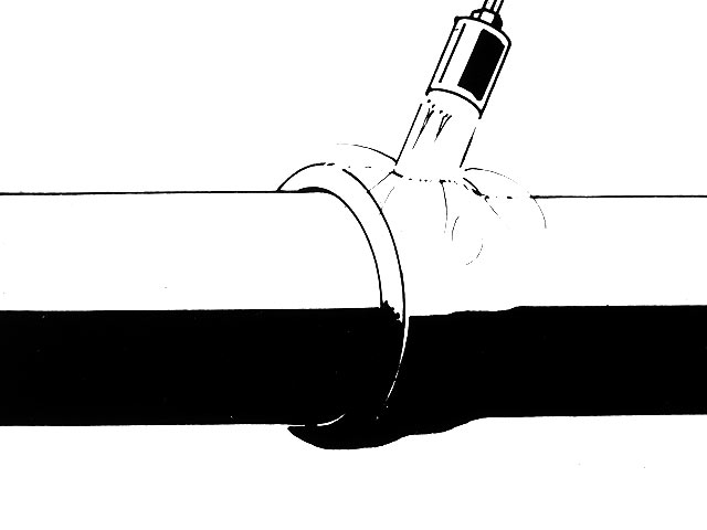 Der für Reparaturzwecke längsgeteilte Schrumpfschlauch (Image 5.2.3.1.1-1) wird um die vorher gereinigte und vorgewärmte abzudichtende Rohrverbindung gelegt und mit einem geeigneten Verschlußsystem - Verschlußlasche oder flexible Schiene aus Chrom-Nickelstahl - verschlossen.