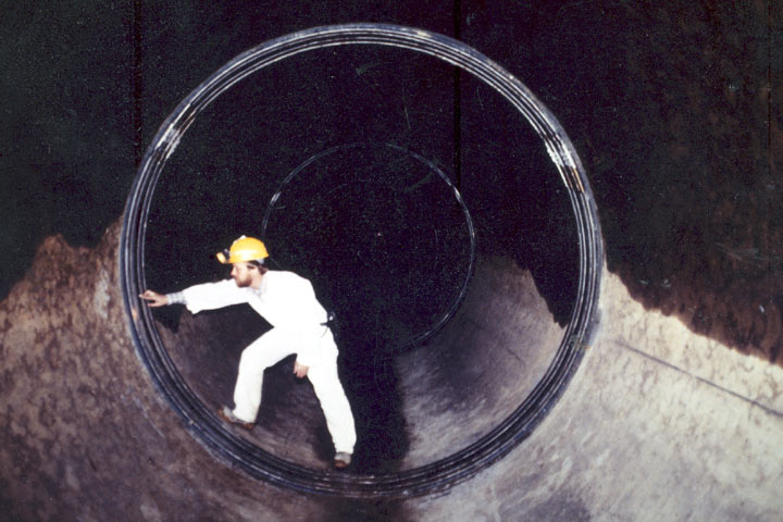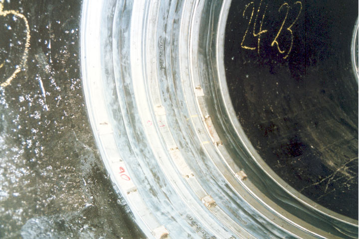 Bei diesem ausschließlich in begehbaren Kanälen oder Schächten eingesetzten Verfahren wird nach einer sorgfältigen Reinigung der Rohrwandungen beiderseits der undichten Stelle eine Elastomer-Dichtungsmanschette von Hand über den abzudichtenden Bereich gelegt und mittels Spannbändern gegen die Rohrwandungsflächen gepreßt (Image 5.2.3.2.3.7.1-1) (Image 5.2.3.2.3.7.1-2) (Image 5.2.3.2.3.7.1-3) (Image 5.2.3.2.3.7.1-4) (Image 5.2.3.2.3.7.1-5) .