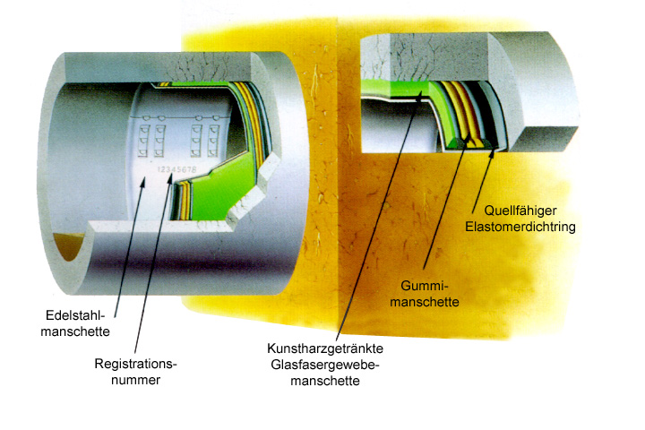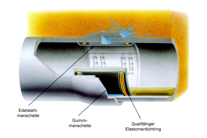 Eine zwischen den außenliegenden Dichtlippen eingelegte, kunstharzgetränkte Glasfasergewebematte bewirkt zusätzlich zur Abdichtung eine Stabilisierung der Tragfähigkeit des so reparierten Kanalabschnittes (Image 5.2.3.2.3.3-8) .