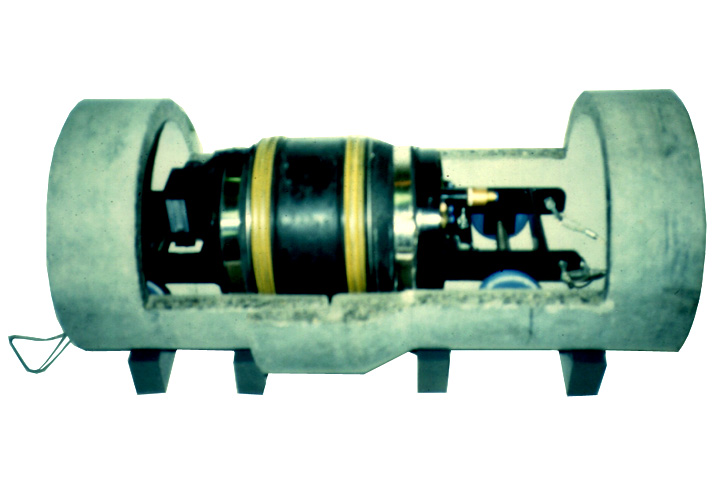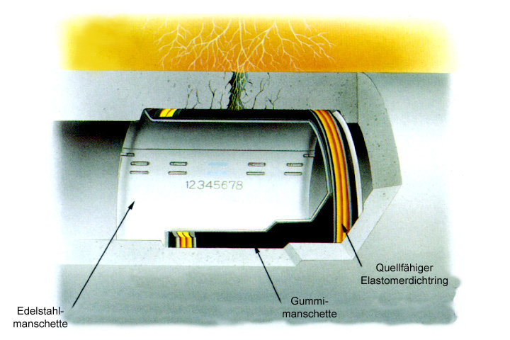 Die Innenmanschette des Snap-Lock-Systems besteht aus einem in Längsrichtung aufgeschnittenen dünnwandigen Zylinder aus rostfreiem Stahl, dessen Schnittkanten sich zur Durchmesserreduzierung überlappen [FI-Link] [Takas90] [FI-Isekib] . Auf der Außenseite befindet sich eine Gummimanschette mit je zwei Dichtungsringen an den beiden Stirnseiten aus einem bei Wasserzutritt quellfähigen Elastomer (Image 5.2.3.2.3.3-3) (Image 5.2.3.2.3.3-4) (Image 5.2.3.2.3.3-5).