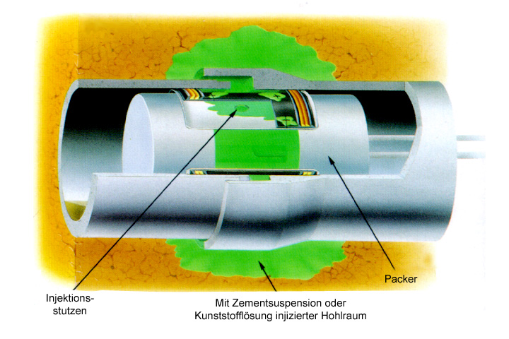 Zusätzliche Injektionsöffnungen im Grundsystem ermöglichen die Verfüllung von Hohlräumen und die Bodenverfestigung im Bereich der Leitungszone. Die Innenmanschette übernimmt im Rahmen der Injektion (Abschnitt 5.2.2.4.1) die Funktion eines verlorenen Packers (Image 5.2.3.2.3.3-9) .