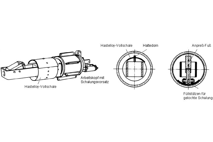 - Einrichtung für Teil- oder Vollauskleidungen aus sog. Hastelloy-Schalen (Image 5.2.1.6.2-5) zur Verbesserung der statischen Tragfähigkeit des Kanals. Die Schalen werden nach dem Verlegen hinterfüllt und abgeglättet.