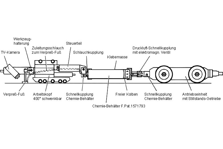 Das Injizieren und Verfüllen von Rissen, Rohrverbindungen und Öffnungen in der Rohrwand erfolgt im Gegensatz zum KA-TE-System unter Verwendung einer Teilschalung (Verpreßfuß) und mit hochviskos eingestelltem, lösemittelfreiem Epoxidharz, welches unter Druck eingetragen wird [FI-eta] . Insgesamt stehen für die unterschiedlichen Anwendungsfälle drei Kunstharzformulierungen zur Verfügung. Alle sind nach Herstellerangaben auf nassem Untergrund applizierbar.