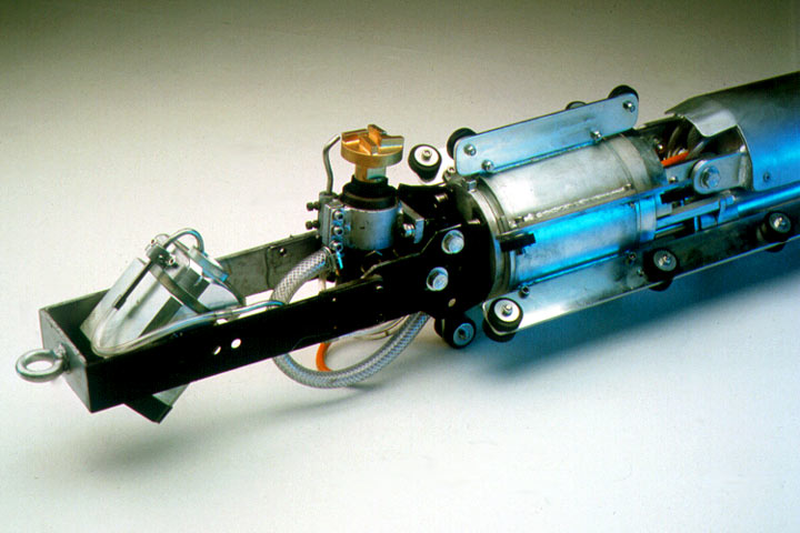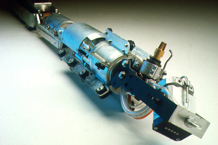 Das SikaRobot-System [FI-Sika] besteht zur Vereinfachung der Einbringung in die Kanäle über Einsteigschächte aus drei gelenkig miteinander verbundenen Maschinenteilen (Image 5.2.1.6.2-1) (Image 5.2.1.6.2-2) (Image 5.2.1.6.2-3) (Image 5.2.1.6.2-4) . Dabei handelt es sich in der Grundversion um Antriebseinheit, Steuerteil und Arbeitskopf mit Werkzeughalterung sowie einer TV-Kamera zur visuellen Kontrolle der Reparaturarbeiten.