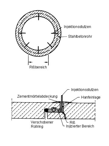 Aus diesen Gründen findet überwiegend das nachfolgend beschriebene Verfahren Anwendung. Hierbei handelt es sich um eine Weiterentwicklung der Rißinjektion für den Einsatz im Rohrverbindungsbereich.