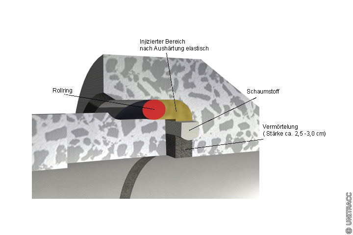 Zur dauerhaften Abdichtung der Rohrverbindungen wird für die Injektion in den Fugenspalt ein Polyurethan eingesetzt (Image 5.2.2.3.3-1) . Ein Fugenabschluß von innen aus kunststoffmodifiziertem Zementmörtel übernimmt die Abdichtungs- und Widerlagerfunktion beim Injektionsvorgang.