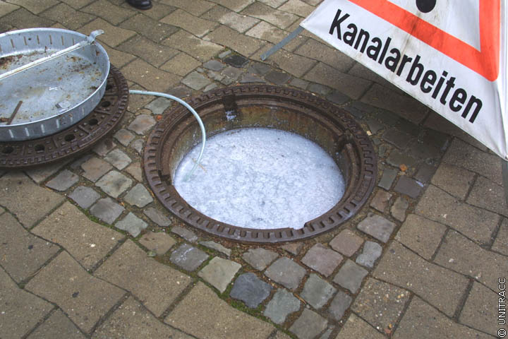 Die Abdichtung erfolgt in zwei Arbeitsschritten (Animation 5.2.2.4.4.2.2-1) . Im ersten wird die betreffende Haltung über den Schacht mit der Lösung A gefüllt und in Abhängigkeit von den örtlichen Bedingungen mit einem Druck von 0,1 - 0,4 bar beaufschlagt (Image 5.2.2.4.4.2.2-1) (Image 5.2.2.4.4.2.2-2) (Image 5.2.2.4.4.2.2-3) (Image 5.2.2.4.4.2.2-4) (Image 5.2.2.4.4.2.2-5) (Image 5.2.2.4.4.2.2-6) (Image 5.2.2.4.4.2.2-7) (Image 5.2.2.4.4.2.2-8). Dabei dringt diese Lösung in die Undichtigkeiten bzw. durch diese in den Boden ein. Der hierdurch verursachte Druckverlust wird durch kontinuierliche Zugabe des Injektionsmittels solange ausgeglichen, bis kein Druckabfall mehr feststellbar ist. Nach etwa 15 bis 30 Minuten (bei einzelnen Verfahren auch 40 bis 60 Minuten [FI-Ratho] ) wird im zweiten Arbeitsschritt der Rest der Lösung A aus der Haltung gepumpt und anschließend die Lösung B unter den gleichen Bedingungen eingeleitet. Durch Reaktion mit der in den Hohlräumen verbliebenen Lösung A bildet sich ein irreversibles wasserdichtes Hartgel. Der Injektionsprozeß ist mit dem Abpumpen der Lösung B beendet [Maidl81] .