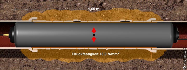 Das Material erhärtet in Abhängigkeit der Temperatur innerhalb von etwa 15 bis 30 Minuten. Die Druckfestigkeit des injizierten Bodens erreicht Werte von 5 bis ca. 19 N/mm2. Diese Sanierung kann ohne Querschnittsverengung und unter Aufrechterhaltung der Vorflut in Kanälen DN 100 bis DN 600 durchgeführt werden. Anstelle des Polyurethansystems ist auch Silikatharz einsetzbar [FI-Janße] [NN97b] .