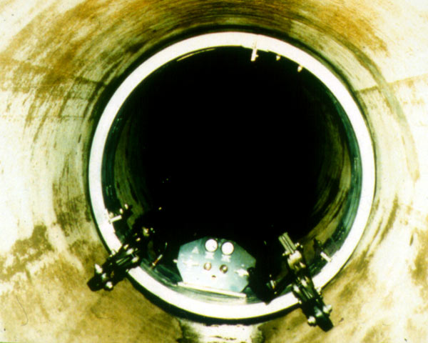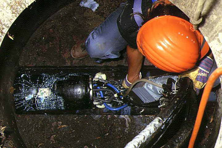 Nach der mittigen Ausrichtung an der Schadensstelle unter Kamerabeobachtung wird der Packer durch Aufblasen der beiden Packermanschetten fixiert. Der verbleibende Zwischenraum ist von der übrigen Leitung gas- und wasserdicht abgeschlossen.