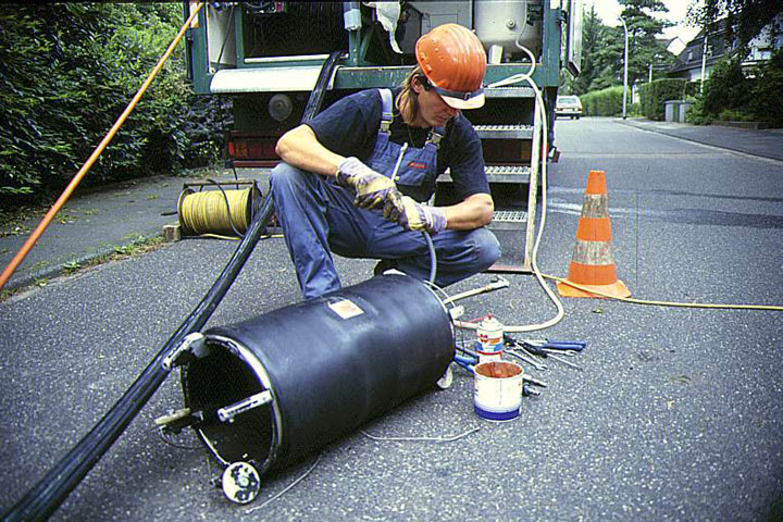 Die erforderlichen Geräte - Kanalfernsehkamera und Packer (Image 5.2.2.4.1.1.1.4-1) (Image 5.2.2.4.1.1.1.4-2) (Image 5.2.2.4.1.1.1.4-3) (Image 5.2.2.4.1.1.1.4-4) (Image 5.2.2.4.1.1.1.4-5) (Image 5.2.2.4.1.1.1.4-6) (Image 5.2.2.4.1.1.1.4-7) - werden über den Schacht in die Haltung eingeführt und mittels einer Winde ferngesteuert zur Schadensstelle gezogen und dort positioniert.