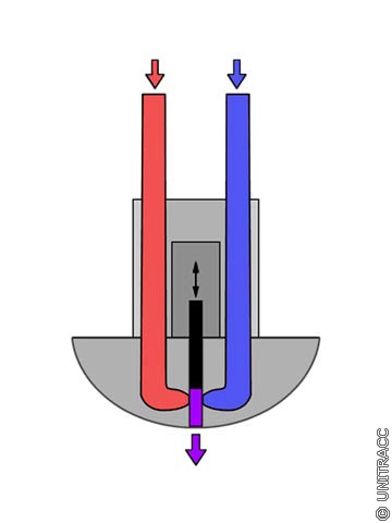 Die beiden Injektionsmittelkomponenten passieren vor dem Austritt in den Hohlraum ein Mischventil (Hochdruckmischkopf) mit einer sehr kleinen Mischkammer, in der die Komponenten des Materials mit einem Druck von 100 bis 300 bar aufeinander treffen (Image 5.2.2.4.1.1.2-2) . Die große kinetische Energie der Komponenten erzeugt Turbulenzen in der Mischkammer und bewirkt auf diese Weise eine sehr rasche Vermischung. Vorteile dieser Mischtechnik sind die geringe Größe und die Selbstreinigung des Mischkopfes. Durch einen hydraulisch bewegten Stößel werden nach der Injektion nicht nur die Komponentendüsen verschlossen, sondern auch das restliche Material aus der Mischkammer ausgestoßen [Will91] .