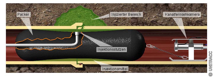 Ein Vertreter dieser Verfahrengruppe ist das in England im Jahre 1983 entwickelte, ursprünglich unter der Bezeichnung "AMK" bekannt gewordene, Amkrete Resin Injection Process-Verfahren [FI-AMK] [NN86f] . Es wird eingesetzt zur Abdichtung und/oder Verfestigung von Undichtigkeiten, Längs- und Querrissen, Rohrbrüchen und Hohlräumen in der Leitungszone bei Kanälen DN 100 bis 500 aus Beton, Steinzeug, Asbestzement und Gußeisen. Die Haltungslänge kann bei beidseitigem Zugang bis 300 m und bei einseitigem Zugang bis 150 m betragen.
