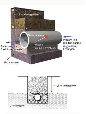 Ein großer Teil dieser Substanzen ist in dem im Boden vorhandenen Wasser gelöst. In Abhängigkeit von der Menge und der Konzentration der Verbindungen im natürlichen Boden oder Grundwasser können diese auf eingeerdete Rohrwerkstoffe aggressiv wirken. Unterstützt wird dieser Vorgang durch die Temperatur und Zeitdauer der Reaktion, die im wesentlichen vom Bodenwassergehalt abhängt.