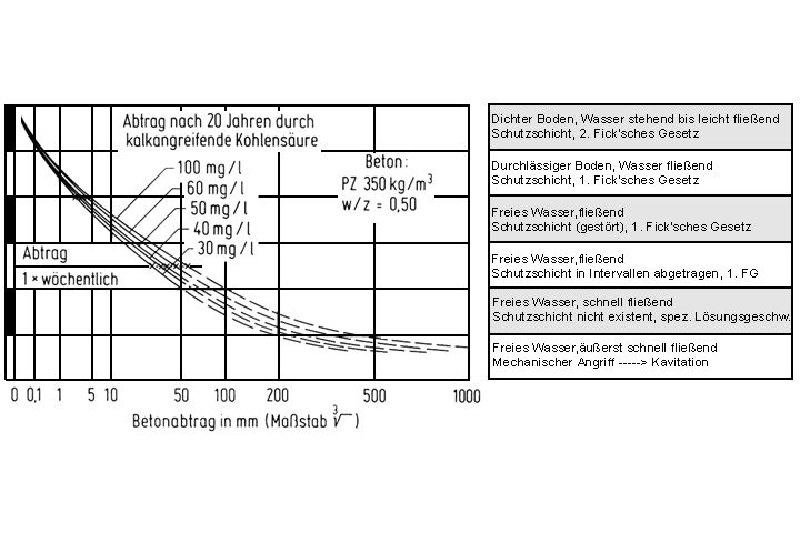 - Bei einem Beton mit quarzitischen Zuschlagsstoffen und einem pH-Wert kleiner 6,5 auf der feuchten Betonoberfläche kann je nach pH-Wert mit einem Korrosionsabtrag von 3 - 6 mm pro Jahr gerechnet werden [Biele87b] [Thist79] .