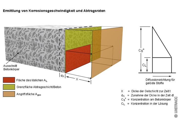 Ein Modell zur Berechnung des Korrosionsabtrages infolge kalkangreifender Kohlensäure ist in [Grube96] beschrieben. Es beruht darauf, daß beim Angriff durch Säuren unlösliche Bestandteile in Form von Silikagel zurückbleiben, die zusammen mit dem unlöslichen Zuschlag eine Schutzschicht bilden. Die Schutzschicht ist gekennzeichnet (Image 2.6.3.2.3-1) durch ihre Dicke x mit dem Diffusionskoeffizienten D sowie der zunehmenden Dicke dx in Abhängigkeit von der Zeit dt. Der Antrieb für das Abwandern des gelösten Calciums ist die Konzentrationsdifferenz cs*-c1 zwischen der Angriffsfront und der außen anstehenden Lösung [Grube96] .