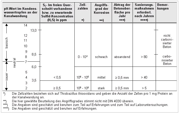 Nach dem Stand der Erkenntnisse signalisieren Grenzwerte für die Gesamt-Sulfidmenge im Abwasser von ≥ 1,0 mg/l bzw. eine H2 S-Konzentration von ≥ 0,5 ppm in der Kanalatmosphäre einen möglichen starken Angriffsgrad der BSK [DIN4060:1988] .