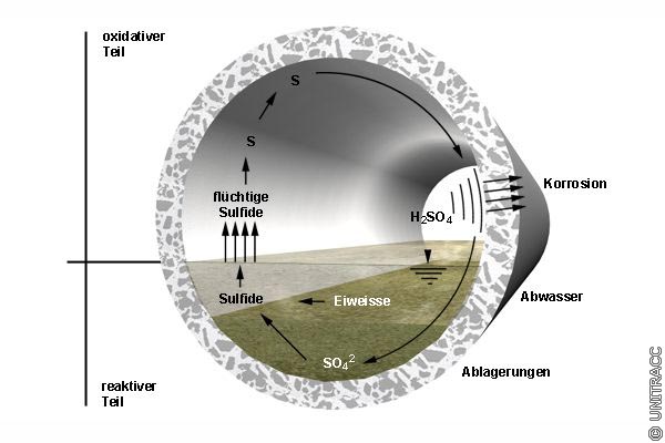 Die im Abwasser sowie in den Ablagerungen - reduktiver Teil der Leitung - enthaltenen Proteine (Eiweißstoffe) werden durch mikrobielle Vorgänge unter anaeroben oder aeroben Bedingungen zu flüchtigen Schwefelverbindungen, hauptsächlich Schwefelwasserstoff, abgebaut. Zusätzlich können durch bakteriellen Stoffwechsel unter anaeroben Bedingungen Sulfate zu Schwefelwasserstoff reduziert werden (Desulfurikation).