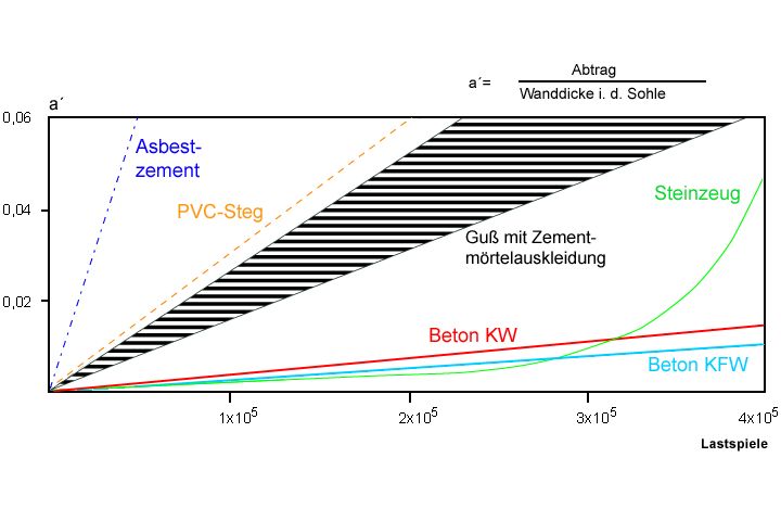 Im Falle der Abwasserkanäle findet der Verschleiß im Bereich der benetzten Rohrinnenfläche und hier vorwiegend im Sohlenbereich statt. Er ist durch einen Materialabtrag (Abrieb) meßbar und führt zu einer Erhöhung der Wandrauheit und im Extremfall zu einer Zerstörung der Rohre (Abschnitt 2.6.1) .