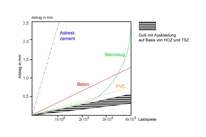 Die üblicherweise verwendete Verschleiß-Meßgröße ist die Reduzierung der Wanddicke des verschleißenden Körpers (Abwasserrohr), die als Verschleißbetrag (Absolutwert) bzw. als Verschleißrate (z.B. Abtrag [mm] pro 105 Lastspiele) angegeben wird (Image 2.5.1-1) (Image 2.5.1-2) .