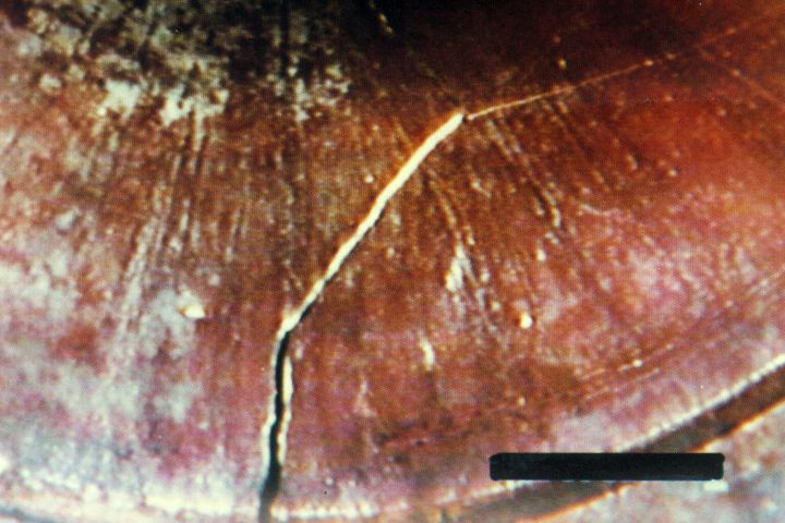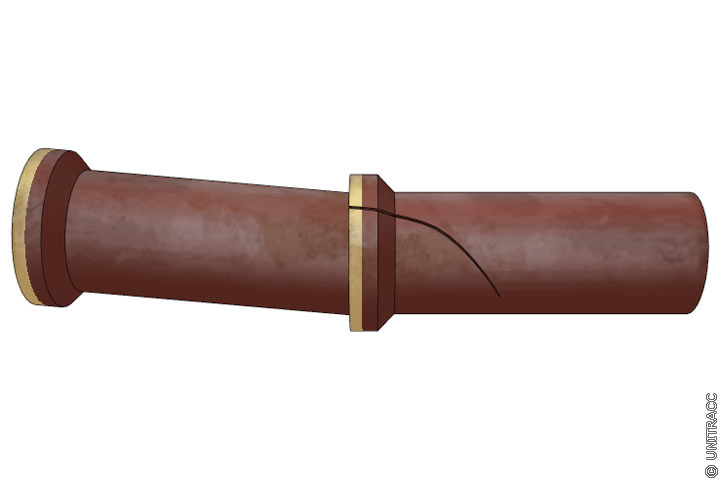 Längsriß im Bereich der Rohrverbindung infolge Lageabweichung - Längsriß in der Rohrverbindung bei einem Steinzeugrohr [FI-KMG]