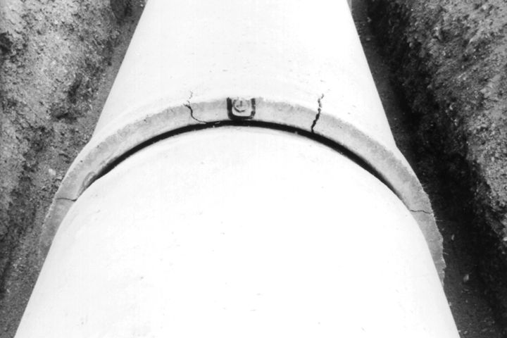 Längsrisse im Bereich der Rohrverbindung durch eine Kombination aus zu hohen Radialkräften und Temperatureinwirkungen während der Bauzeit [Stein95d]