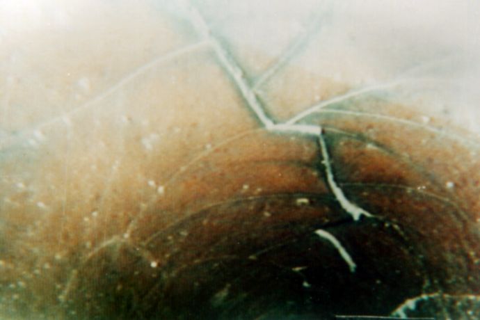Neben den Längs- und Querrissen, die einen relativ eindeutigen Rißverlauf aufweisen, gibt es in Kanälen Risse, die entweder von einem Punkt ausgehend, strahlenförmig verlaufen (Bild 2.8.3.1-1) oder solche mit einem völlig unregelmäßigen Verlauf (Bild 2.8.3.1-2) (Bild 2.8.3.1-3) .