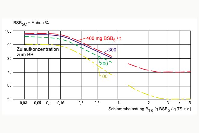 BSB5c - Abbau in einstufigen Belebungsanlagen für unterschiedliche Zulaufkonzentrationen [Damie85]