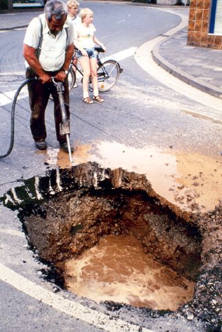 Hohlraumbildung und großflächiger Einsturz desselben infolge nicht fachgerecht verschlossener Dränage und Undichtigkeiten bei einem Abwasserkanal in Seattle [Quick79] - Blick auf den Straßeneinbruch, Krater an der Geländeoberfläche |
