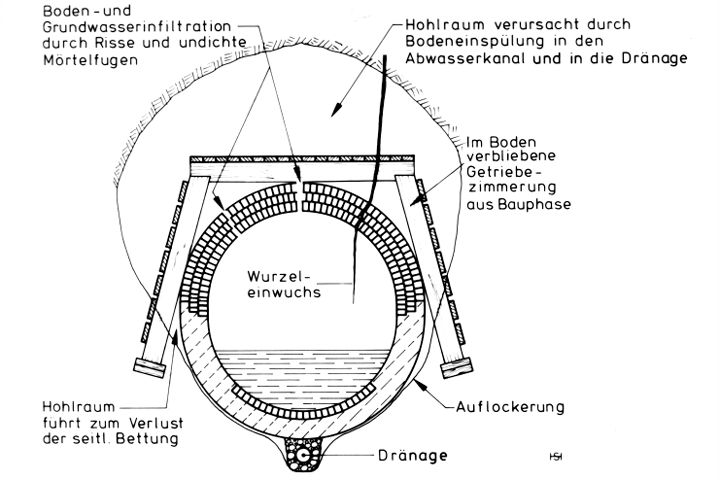 Werden mit dem infiltrierenden Grundwasser Bodenpartikel infolge Erosion oder Suffusion mit eingespült, so führt dies einerseits zu verstärkten Ablagerungen bis hin zu Verstopfungen (Abschnitt 2.3.1) und andererseits zu Änderungen der Bettungsbedingungen durch Auflockerung des Bodens in der Leitungszone bzw. einer mehr oder weniger großen Hohlraumbildung [WRC83] [NN86g] [Quick79] . Die beiden letztgenannten Schadensfolgen führen zur Beeinträchtigung der Standsicherheit des Kanals und stellen Ausgangspunkte für Folgeschäden bis zum Einsturz dar.