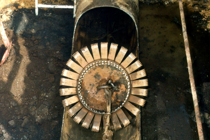 Blick in die Startbaugrube mit aufgeschnittenem Stahlrohr und Stahlfedermolch [FI-Teerb] |