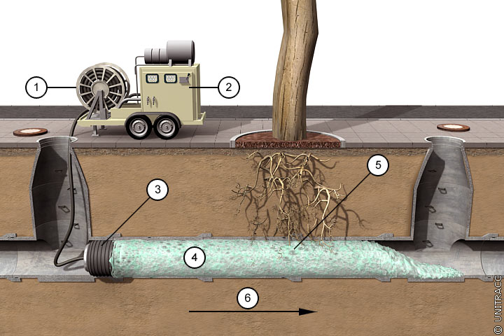 Der Schaum wird in einer speziellen Anlage erzeugt und in die Haltung gedrückt, wo er an den Wurzeln und an den Rohrinnenflächen auch noch nach Wiederinbetriebnahme des Kanals haftet. Durch Umwandlung in Dämpfe wird er von den Wurzeln aufgenommen und führt nach ca. 4 bis 20 Wochen, je nach Konzentration und Kontaktzeit, zu deren Verrottung. Die Wirkungsdauer kann sich auf 2 und mehr Jahre erstrecken.
