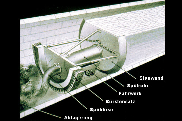 Bei diesem Verfahren werden Geräte in den Kanal eingebracht, die den Querschnitt reduzieren und das Abwasser aufstauen. Durch diesen Aufstau, d.h. durch die Wasserspiegeldifferenz vor und hinter den Geräten, werden sie vorwärtsbewegt und umspült, wobei die nichtverfestigten Ablagerungen aufgelockert und weitertransportiert werden [Führb80] .